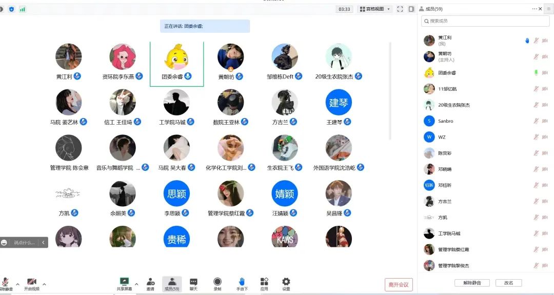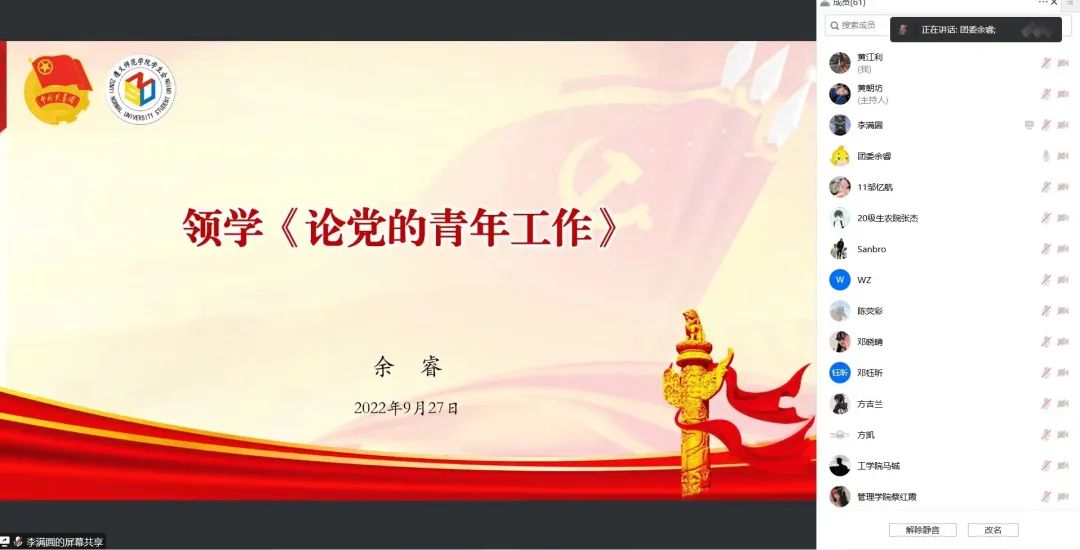会上,余睿领学《论党的青年工作》,她强调广大学生干部要不断强化政治理论学习,与时俱进地开展青年工作,深入理解把握习近平总书记的重要讲话精神,牢记习近平总书记对共青团员提出的五个“模范”和对团干部提出的“四要”要求,持续强化学生会作风建设,以实际行动迎接党的二十大胜利召开。同时对大家提出三点希望,一要提高政治站位,增强责任意识。善于在工作中发现和认识规律,总结方法和经验,平衡好学习和工作之间的关系;二要发挥模范作用,积极服务同学。学生会要在学校防疫工作中带头遵守防疫规定、传播正能量,同时关注同学诉求、收集反馈同学建议,积极帮助同学解决问题;三要重视加强学习,提升工作能力。学生干部是学生群体中的骨干力量,要有主动学习意识,树立正确价值观念,不断增强本领,有的放矢、生动活泼开展工作。