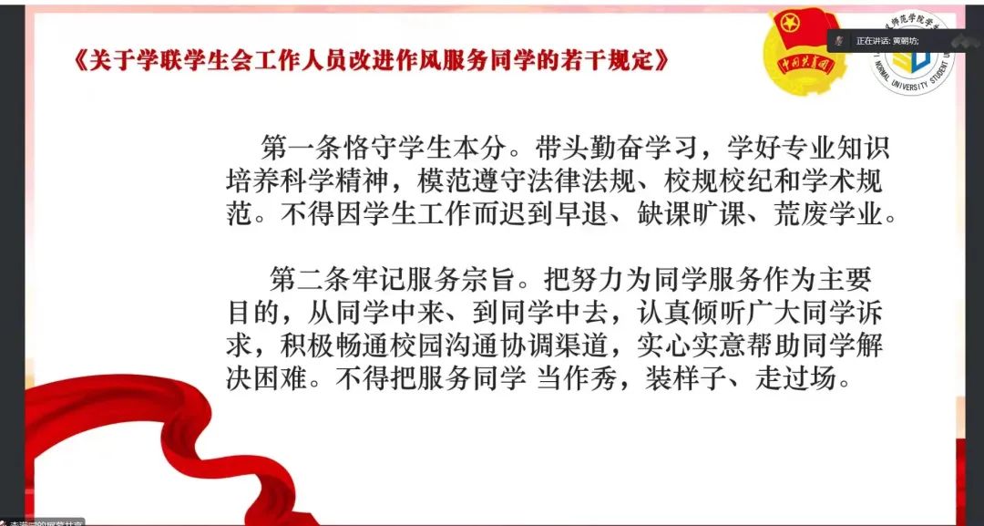 校学生会主席团成员李满园领学了《关于学联学生会工作人员改进作风服务同学的若干规定》,并向与会学生干部提出了“恪守学生本分、牢记服务宗旨、永葆理想情怀、勤勉务实做事、营造平等氛围、摒弃庸俗习气”六条倡议。