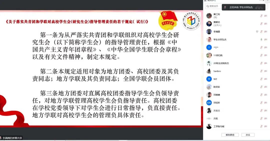 校学生会主席团成员安弘杰对《关于落实共青团和学联对高校学生会(研究生会)指导管理责任的若干规定》文件的主要内容做了相关的解读,并针对文件中关于述职评议制度的要求,对学生会组织的日常工作规范提出要求,号召与会人员牢记自己的责任与使命,坚持从严治会,坚持听党话、跟党走。