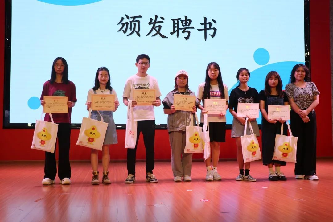 会上,敖正雅为在青媒工作三年的学生干部黄符倩、童玉洁、沈海轩等9位学生记者颁发了聘书及小星火周边纪念品。