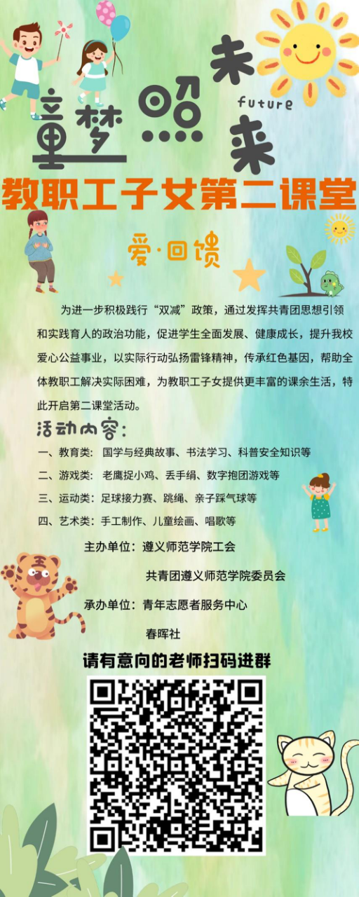 让我们用爱共筑桥梁,将温暖传递给教职工子女。我们热切期盼各位老师的参与,你们和孩子的到来将是对我们最大的支持与鼓励。愿老师与志愿者携起手来,一起为孩子们留下美好的回忆,展望美好的未来!