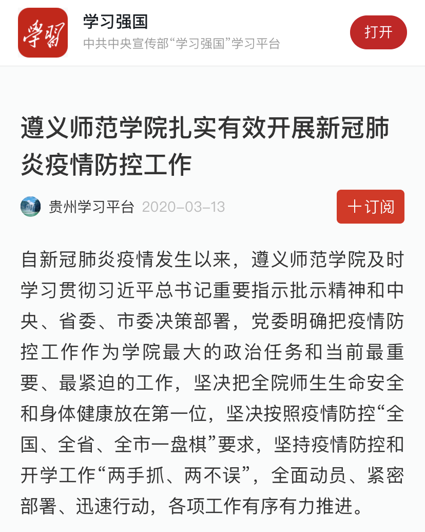 注重对外宣传联络,立体展示买球形象。加强与各级主流媒体对接,在“学习强国”学习平台、《贵州日报》、贵州广播电视台客户端“动静贵州”、多彩贵州网、《遵义日报》等主流媒体平台持续发出买球声音,策划撰写了《微信买球官方网站扎实有效开展新冠肺炎疫情防控工作》《微信买球官方网站:疫情防控不放松线上开学不延迟》《防疫控疫买球人在行动》《微信买球官方网站“三个强化”做好新型冠状病毒感染的肺炎疫情防控工作》等专题报道,引发社会多方关注。已在校外媒体刊播发有关我院疫情防控工作的新闻40余条。其中,《“三个强化”做好新冠肺炎疫情防控工作》在人民网主办“网络舆情”公众号“疫情防控联播“专栏上作为地方经验予以宣传报道;公益歌曲《仁心永恒》MV先后获遵义广播电视台、“多彩贵州网”、“学习强国”学习平台推送,并入选全国校园抗击疫情主题原创歌曲MV展播。