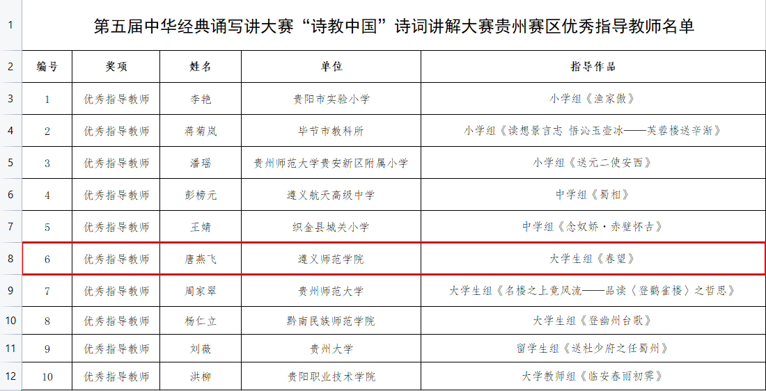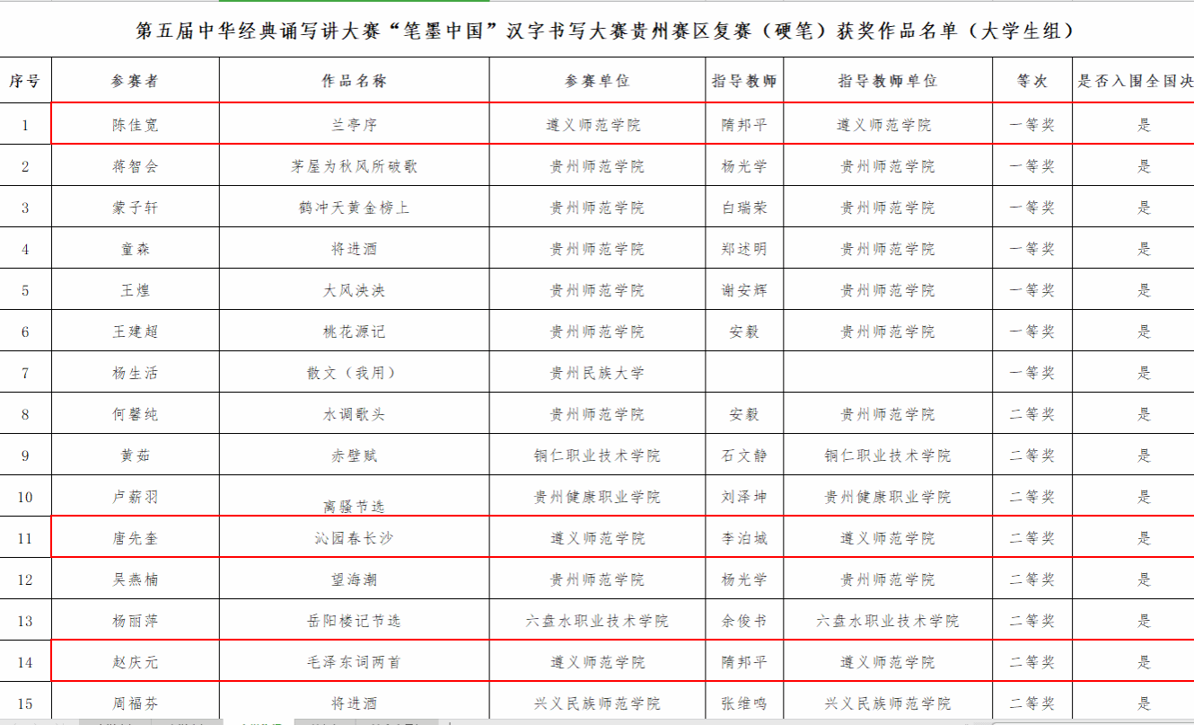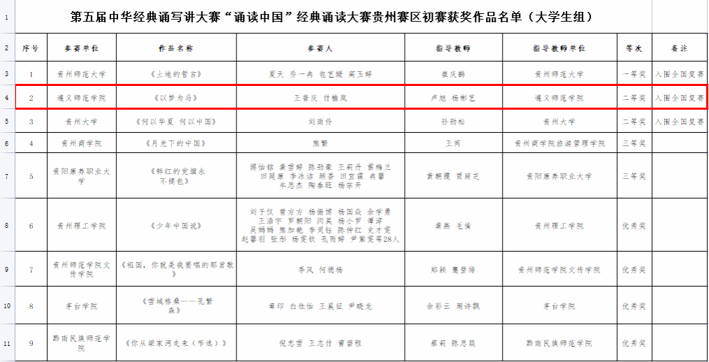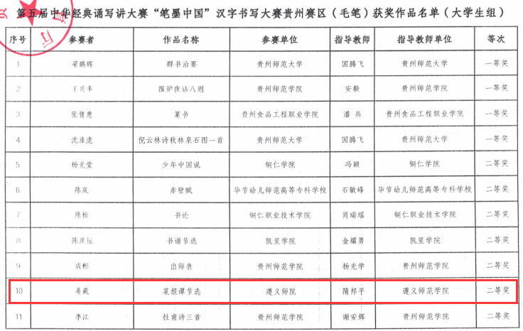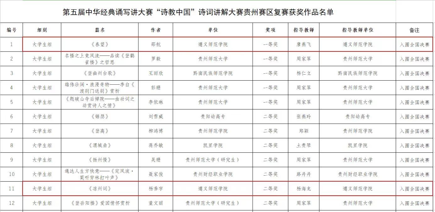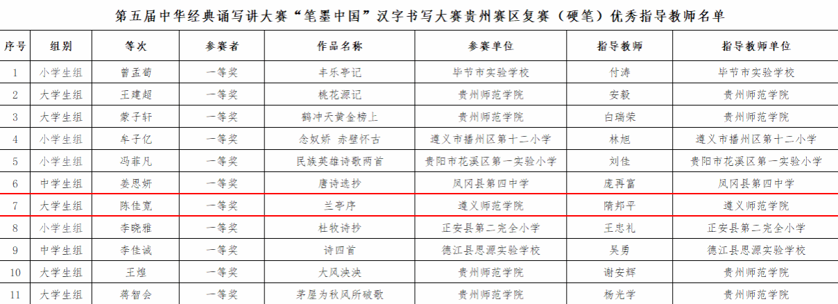 近日,省教育厅公布第五届中华经典诵写讲大赛贵州赛区初复赛获奖作品名单,买球师生在各类别赛事中喜获佳绩。