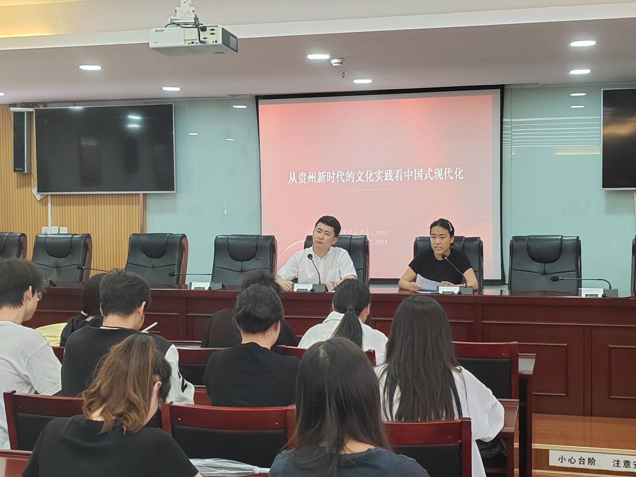 6月24日,微信买球官方网站“理论宣传二人讲”示范讲开讲在行政楼214开讲,党委宣传部理论科科长周选州和马克思主义学院23级长征班吴思雨结成对子,以师生“1+1”“理论+实践”的形式为全校各二级学院“理论宣传二人讲”学生宣讲员作了题为《诵文化之诗 歌黔进之章——从贵州的新时代文化实践领会习近平文化思想》的宣讲。