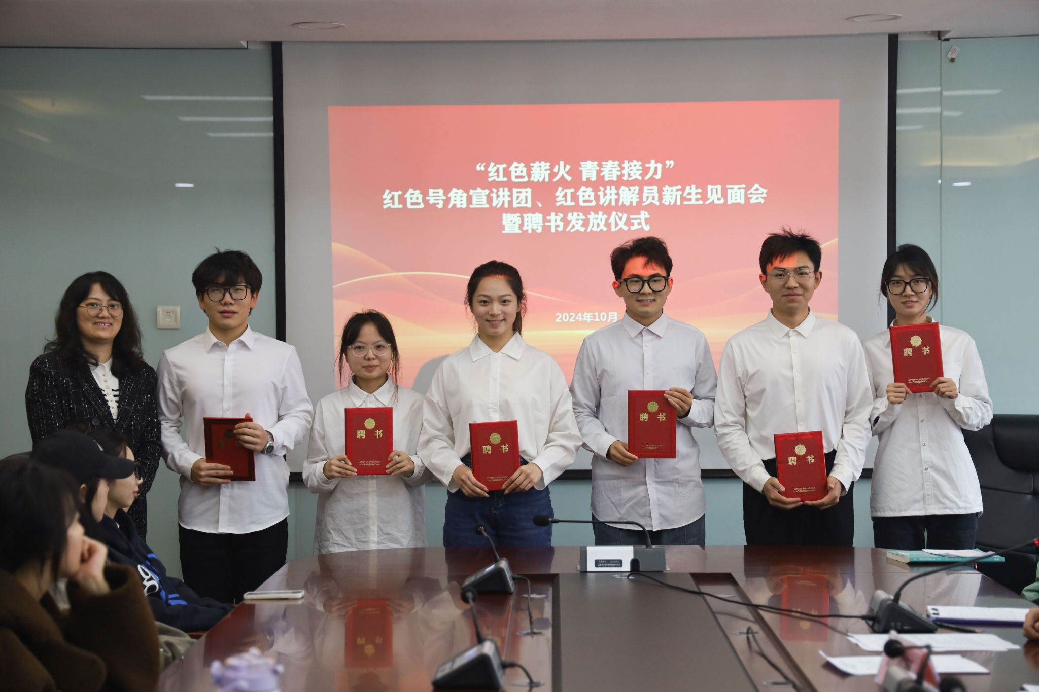 为深入学习贯彻党的二十届三中全会精神,传承红色基因,培育时代新人,进一步加强学校红色宣讲、红色讲解队伍建设,10月21日,党委宣传部举行“红色薪火 青春接力”“红色号角”宣讲团、红色讲解员新生见面会暨聘书发放仪式。党委宣传部副部长叶颖,“红色号角”宣讲团、红色讲解队2022级、2023级老生代表以及2024级新生代表参加见面会。活动由指导教师郑钧主持。