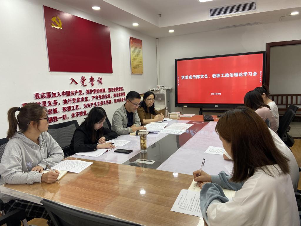 9月29日,党委宣传部在行政楼304会议室召开2021年第21次教职工理论学习会暨党史学习教育、“牢记殷切嘱托、忠诚干净担当、喜迎建党百年”专题教育学习会。党委宣传部部长王春华主持,全体干部职工参加。