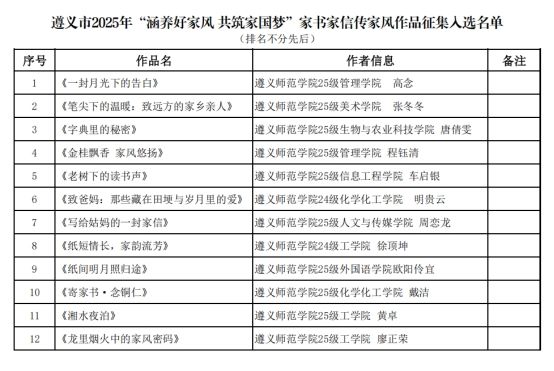所有入选的优秀作品将于2025年10月10日至10月31日期间,通过遵义市妇女联合会官方微信公众号、买球学工在线微信公众号等平台进行集中展播宣传。届时,广大师生可通过线上渠道,共同品读这些温暖人心的家书故事,感受字里行间的温暖真情,领略优良家风的深厚底蕴与时代光芒。