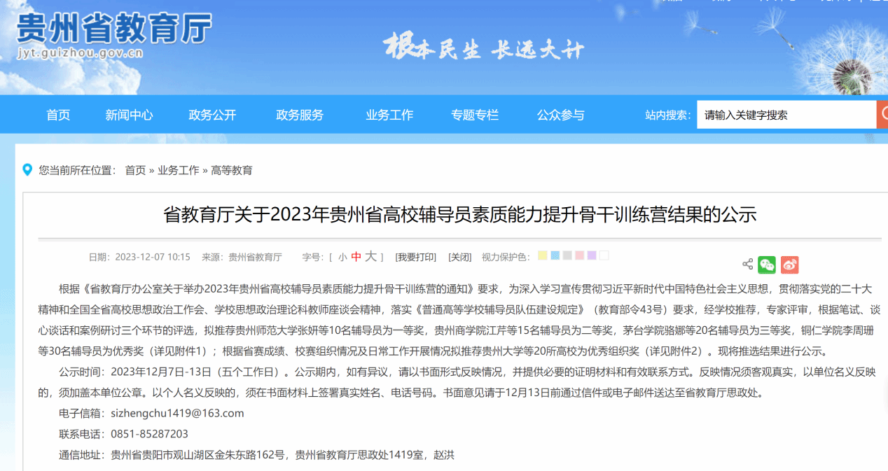 2023年9月19日-22日,2023年贵州省高校辅导员素质能力提升骨干训练营在贵州大学举行,买球辅导员谌迪、张坤美获三等奖。