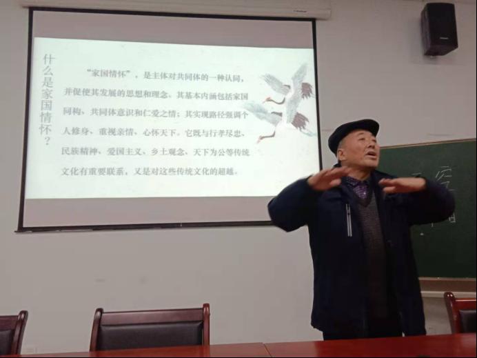 简澈教授作题为“传统文化中的家国情怀”。对民族要有“先天下之忧而忧,后天下之乐而乐”的责任担当,对父母要善事父母、慎终追远;对子女要正家风、齐家规,砥砺道德追求和理想抱负;对朋友相互尊重、彼此谦让,主动承当责任,坚守社会道义。