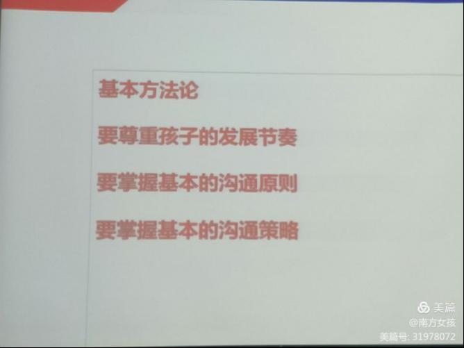 辑老师给我们分享的内容包括基本方法论、要尊重孩子的发展节奏、要掌握基本的沟通原则和要掌握基本的沟通策略四个方面。
