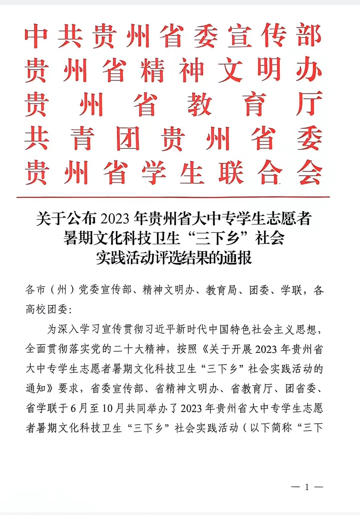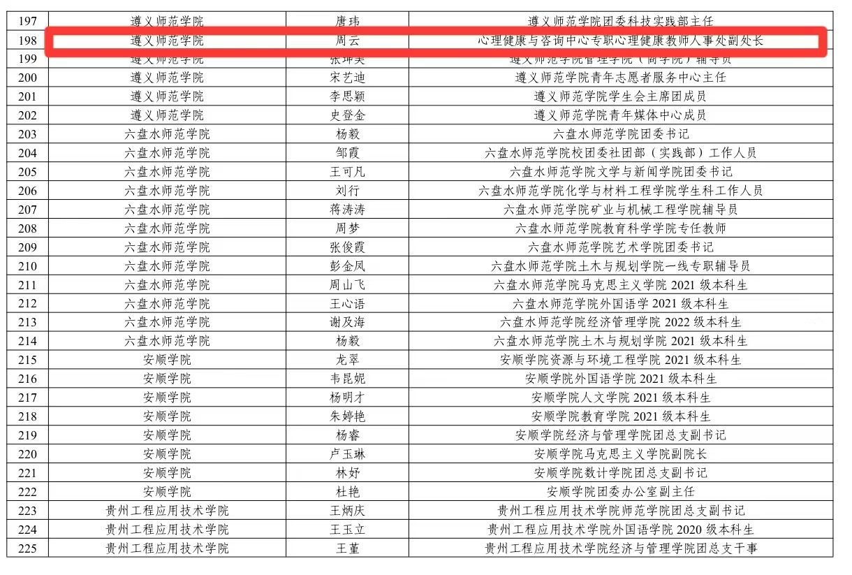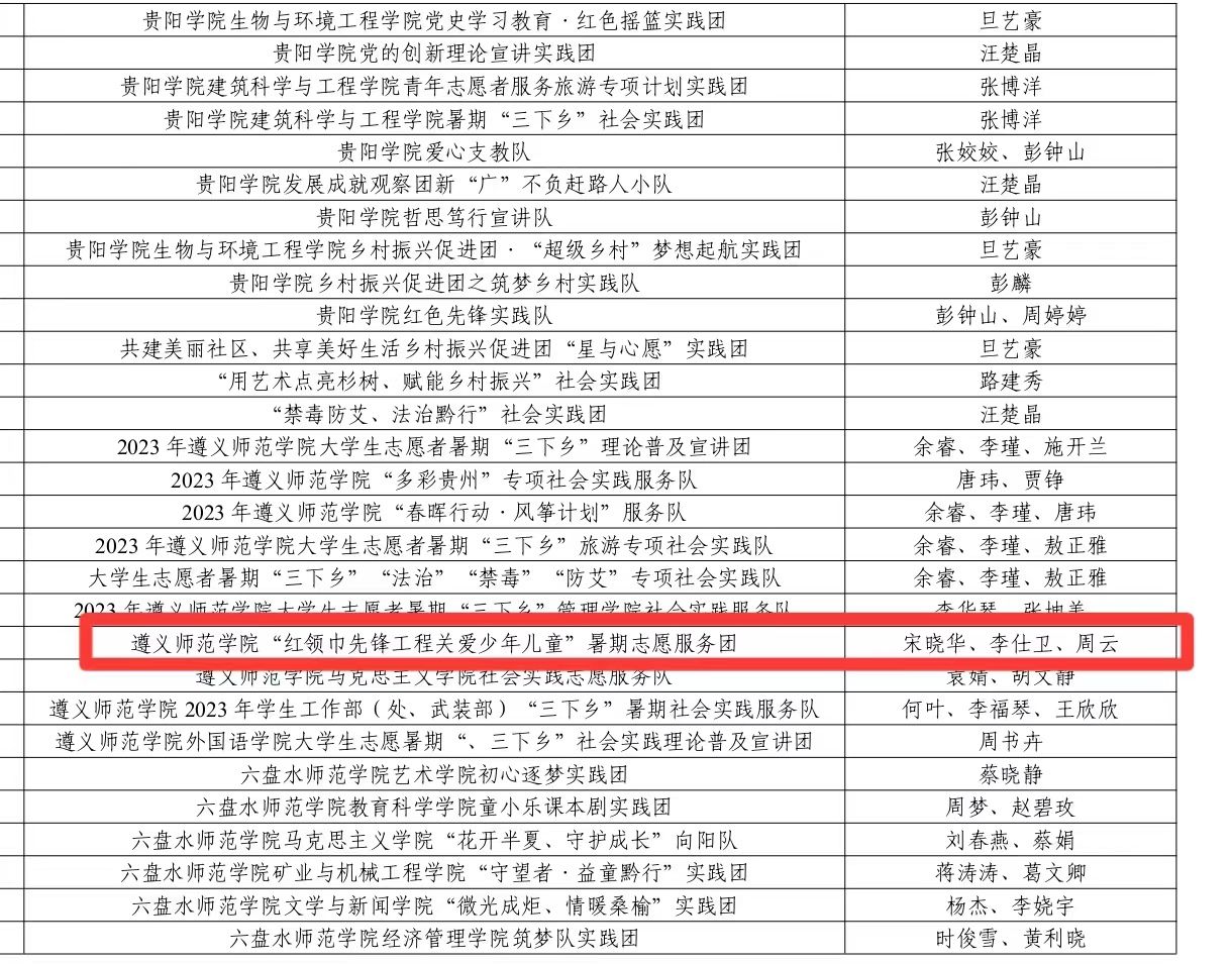 近日,2023年贵州省大中专学生志愿者暑期文化科技卫生“三下乡”社会实践活动评选结果公布。由微信买球官方网站心理健康与咨询中心李仕卫、宋晓华等组建的微信买球官方网站“红领巾先锋工程关爱少年儿童”暑期志愿服务团获评2023 年贵州省大中专学生志愿者暑期文化科技卫生“三下乡”社会实践活动优秀实践团队。人事处副处长、心理健康与咨询中心教师周云获评2023 年贵州省大中专学生志愿者暑期文化科技卫生“三下乡”社会实践活动优秀实践个人。