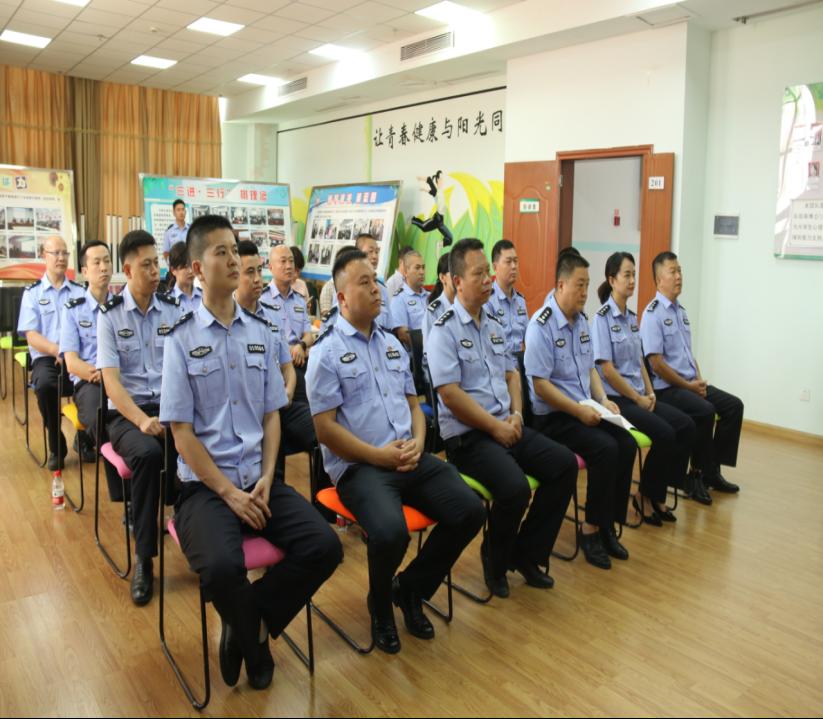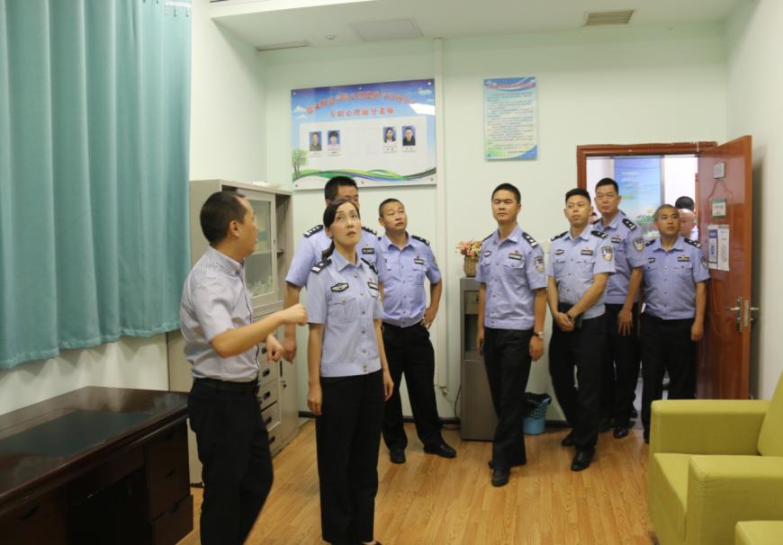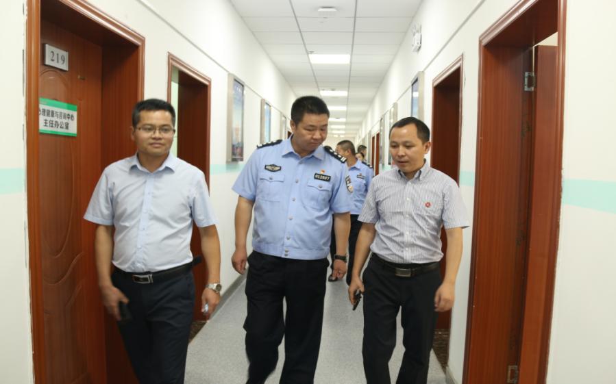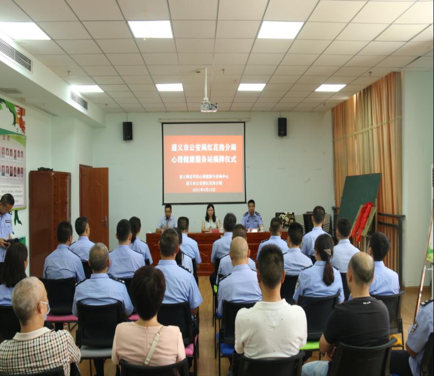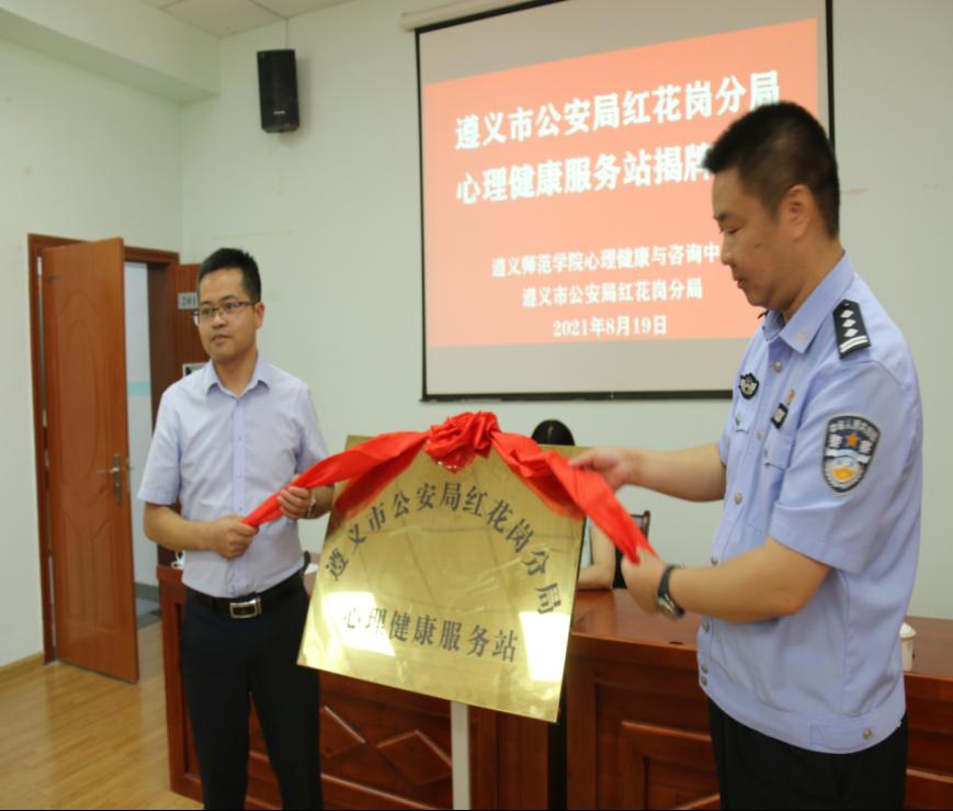 遵义市公安局红花岗分局党委委员、政工室主任郑启立与教师教育学院院长、心理健康与咨询中心负责人朱海共同为遵义市公安局红花岗分局心理健康服务站揭牌。揭牌仪式后,红花岗分局全体公安干警参观了心理健康与咨询中心,详细了解了中心各项功能室。