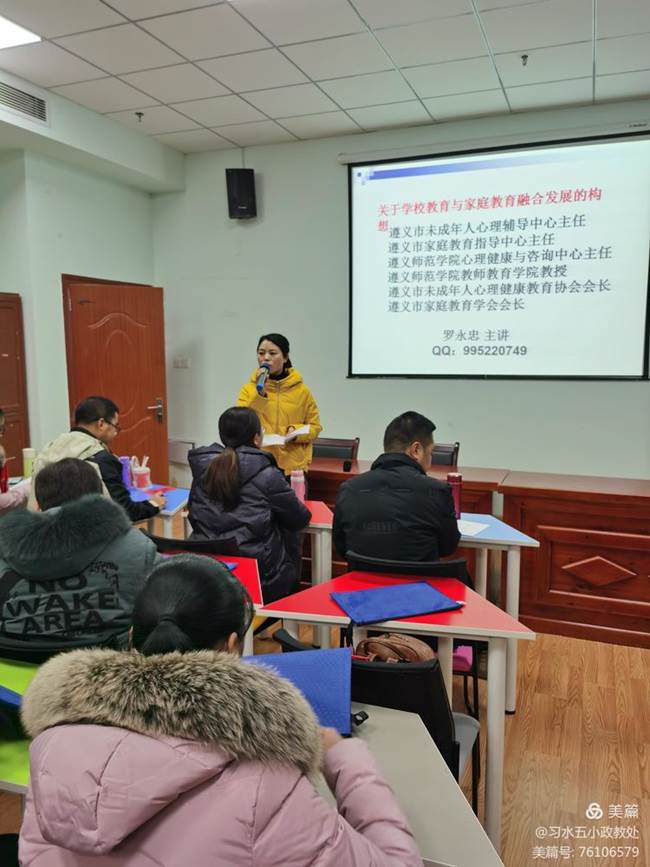 罗永忠教授给我们带来《家校融合创新模式的思考》的主题讲座。苏霍姆林斯基多次指出:“教育的效果取决于学校和家庭的教育影响的一致性。”要教育好一个学生,不能只靠班主任一个人,要调动一切可调动的力量,形成教育合力。 只有家校共携手,才能构建和谐校园;我们应该不断优化少年儿童健康成长的社会环境,全面提高家长的家庭教育水平和讲究家庭教育方法,目标是动力,关爱是基石,让家校筑起孩子的成功之路。