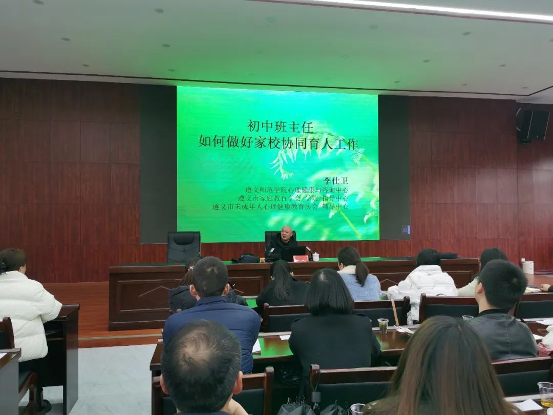 为落实立德树人根本任务,充分发挥学校在协同育人中的主导作用,全面提升基础教育学校管理干部和班主任的的协同育人能力,积极构建学校家庭社会协同育人新格局。2023年3月12日,微信买球官方网站心理健康与咨询中心(遵义市家庭教育指导中心)组织罗永忠、王洪叶、许锐、周云、李仕卫、王震涛、蔡丽婷、张阳英等专家赴桐梓县为1500余名中小学管理干部及班主任开展专题培训。