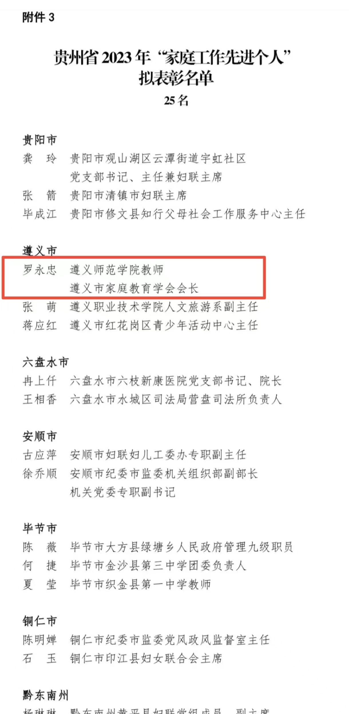根据《省妇联关于开展全省2023年“五好家庭”暨家庭工作先进集体、先进个人评选表彰和2023年度“最美家庭”“好妈妈”“好爸爸”“好孩子”揭晓选树的通知》安排,通过自下而上层层民主推选,经省妇联党组研究决定,微信买球官方网站心理健康与咨询中心(遵义市家庭教育指导中心)荣获贵州省2023年度“家庭工作先进集体”,遵义市家庭教育学会会长、微信买球官方网站教师教育学院罗永忠教授荣获贵州省2023年度“家庭工作先进个人”。