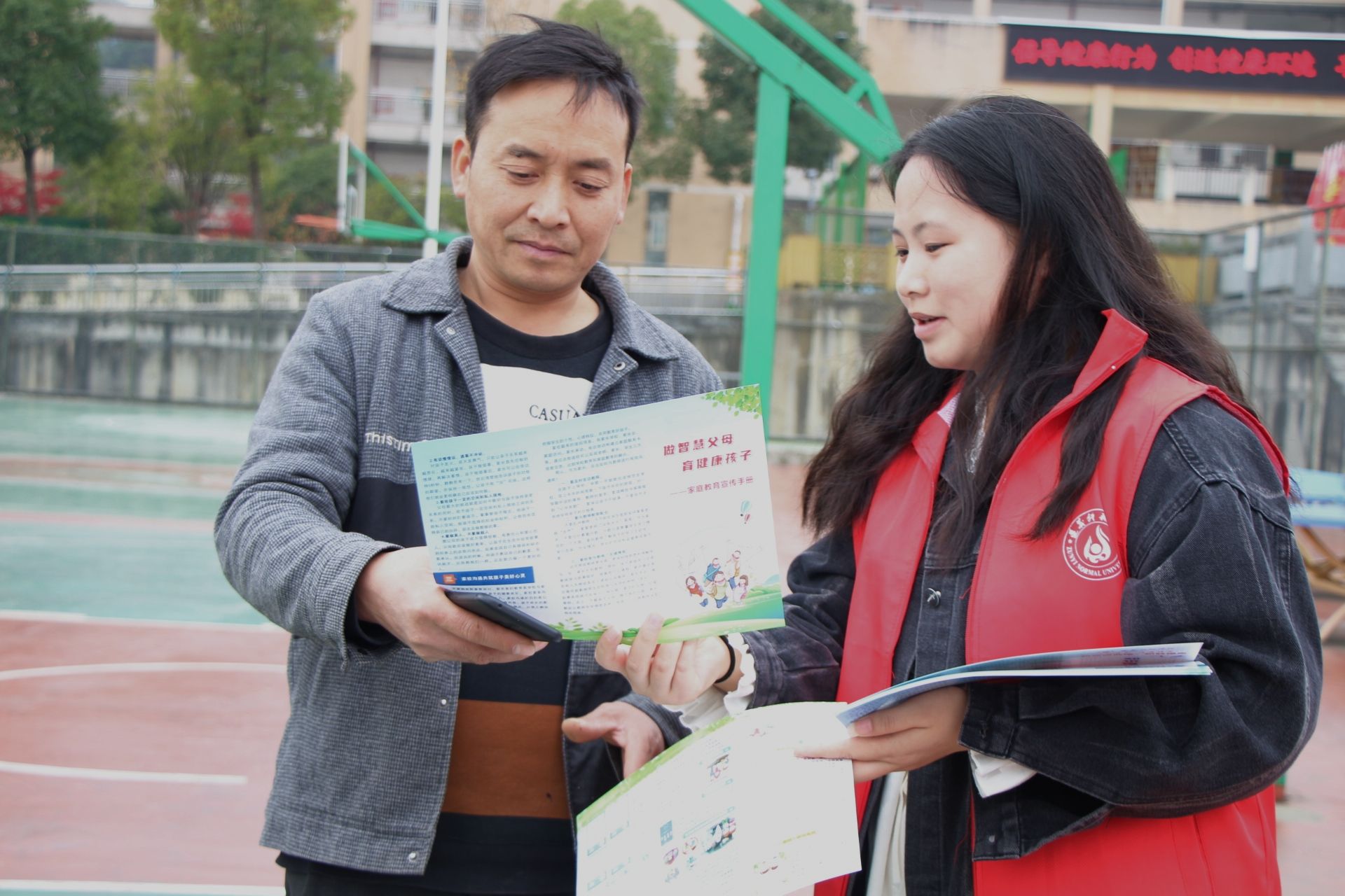 图16:志愿者为家长发放家庭教育宣传手册并讲解相关知识