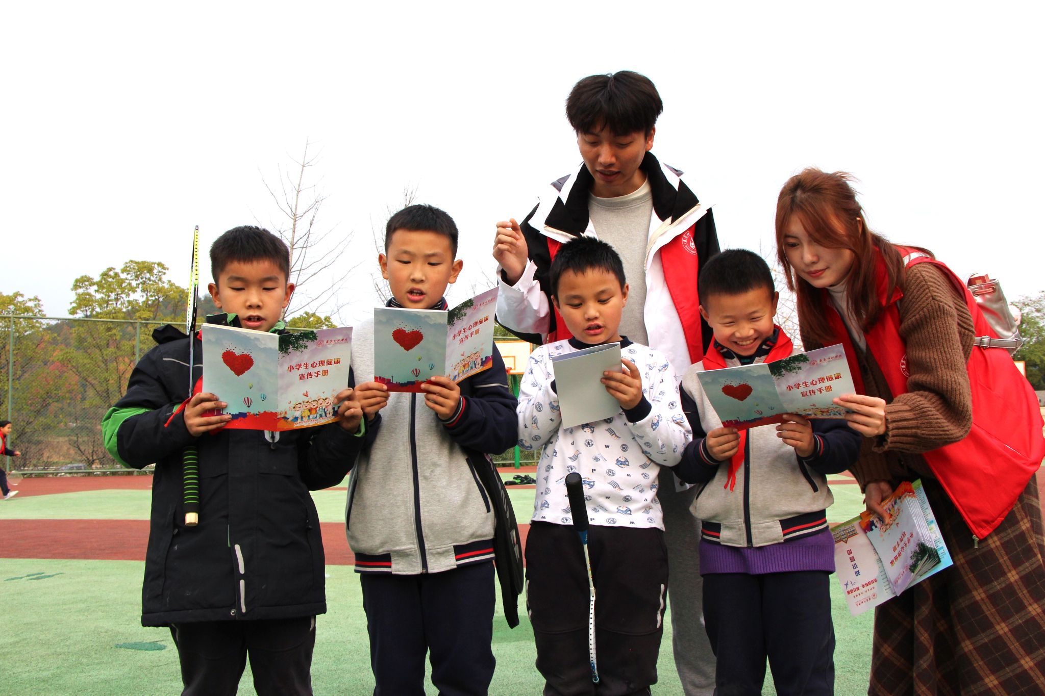 图18:志愿者为学生发放心理健康教育宣传手册并讲解相关知识