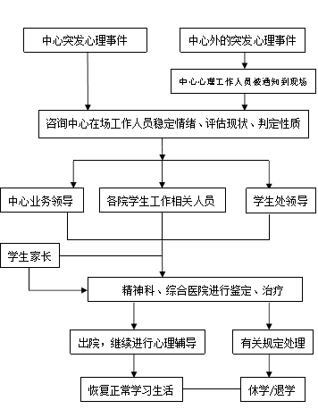对于发生在中心的心理事件,在任何情况下,一旦出现即将进行、正在进行或已经完毕的自残自伤自杀、伤害他人或其他危害社会秩序及校园安全的事件,本中心在确认无误情况下立即启动心理危机处置预案。