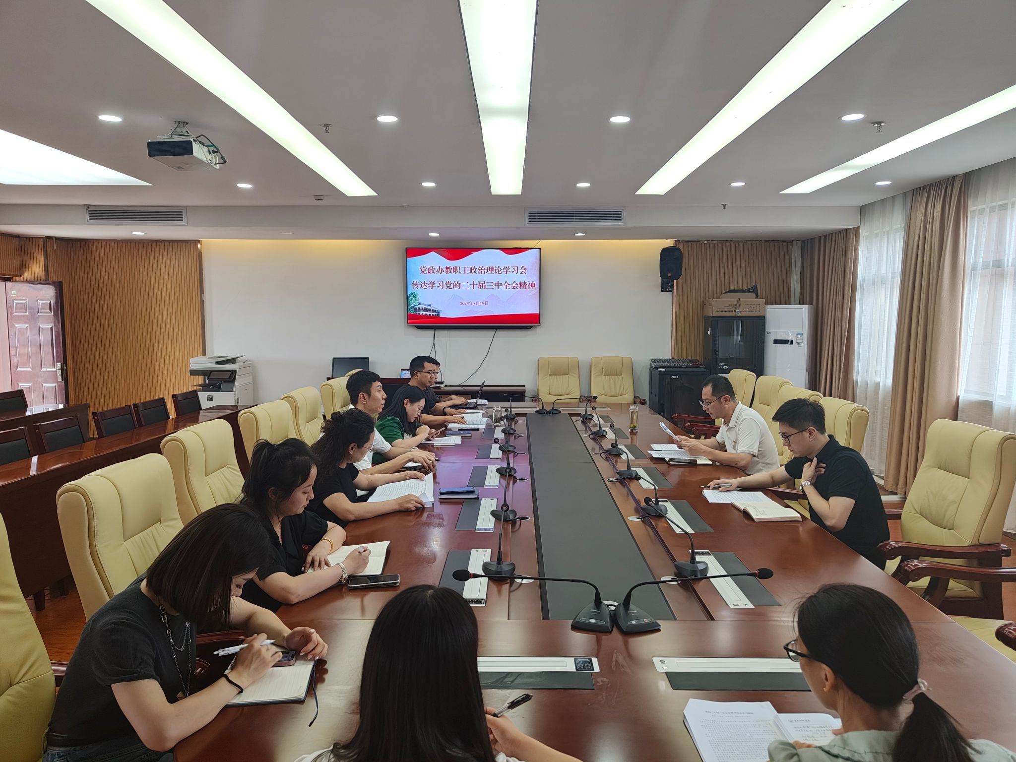 2024年7月19日下午,党政办公室在行政楼516会议室召开教职工政治理论学习会,传达学习党的二十届三中全会精神。受党政办主任付强主任委托,党政办副主任丁亮主持会议。