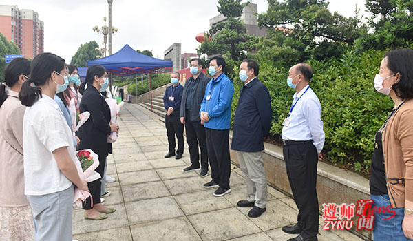 学院党委书记张波、院长刘肇军、党委副书记洪涛、副院长曾伯平、纪委书记刘剑在学院北门迎接并慰问学生志愿者。